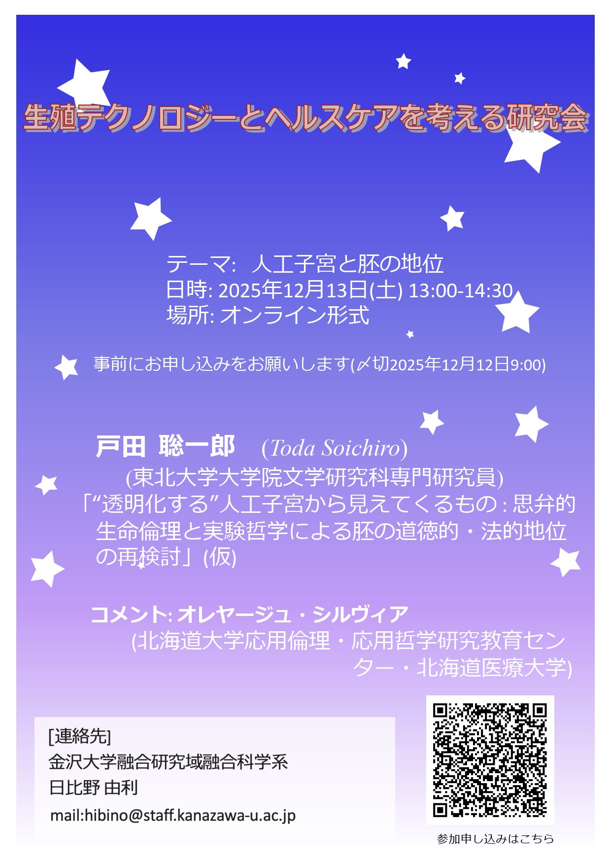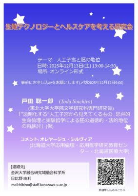 「“透明化する”⼈⼯⼦宮から⾒えてくるもの: 思弁的⽣命倫理と実験哲学による胚の道徳的・法的地位の再検討」(仮)