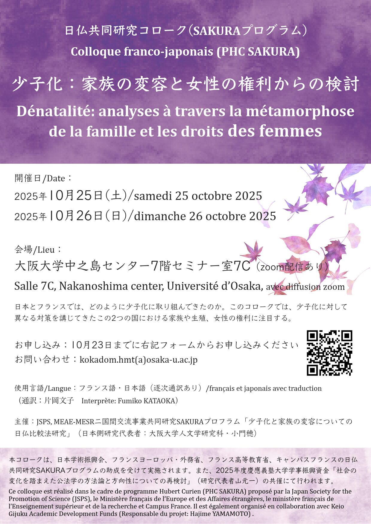 主催:JSPS, MEAE-MESR二国間交流事業共同研究SAKURAプログラム「少子化と家族の変容についての日仏比較法研究」(日本側研究代表者:小門穂)
