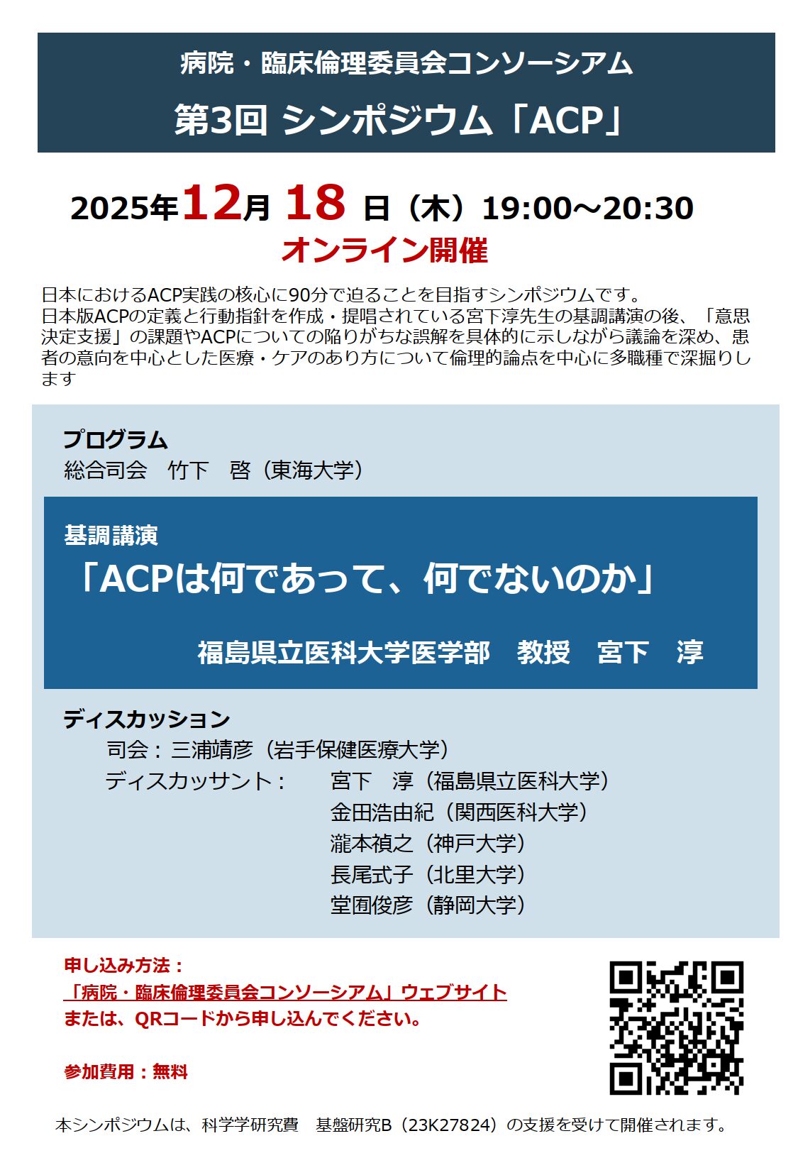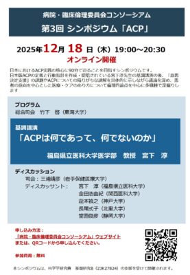 病院・臨床倫理委員会コンソーシアムはACPをテーマに第3回シンポジウムを下記の通り開催します。