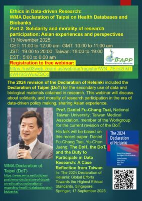 世界医師会(WMA)のヘルスデータベースとバイオバンクに関する台北宣言の改訂と関連したWebinarを下記のとおり開催いたします。(使用言語:英語)