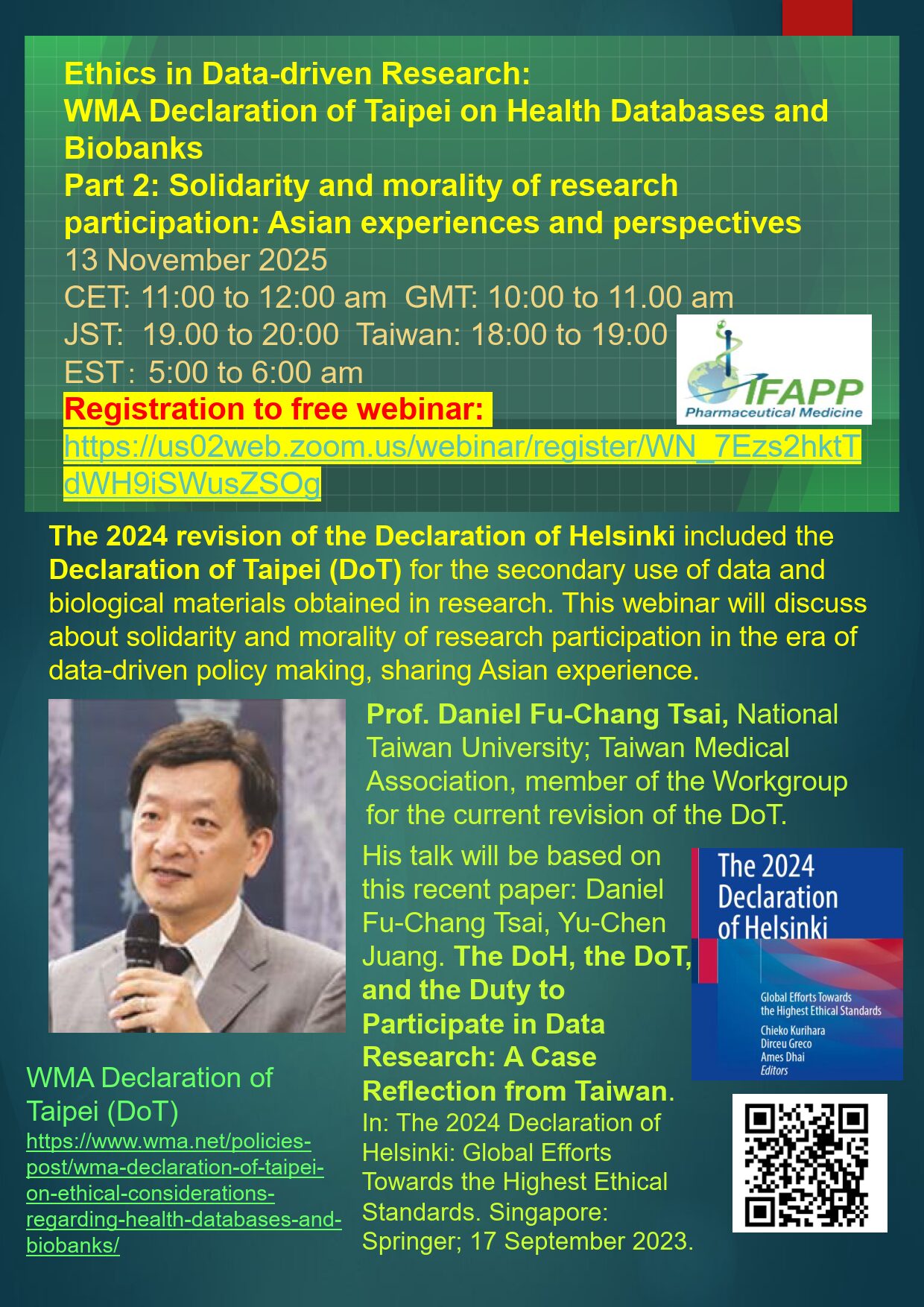 直前のご案内となりまして申し訳ありません。 国際製薬医学会(IFAPP)では、「データ駆動型研究の倫理:ヘルスデータベースとバイオバンクに関するWMA台北宣言」をテーマとして連続Webinarを開催しています。