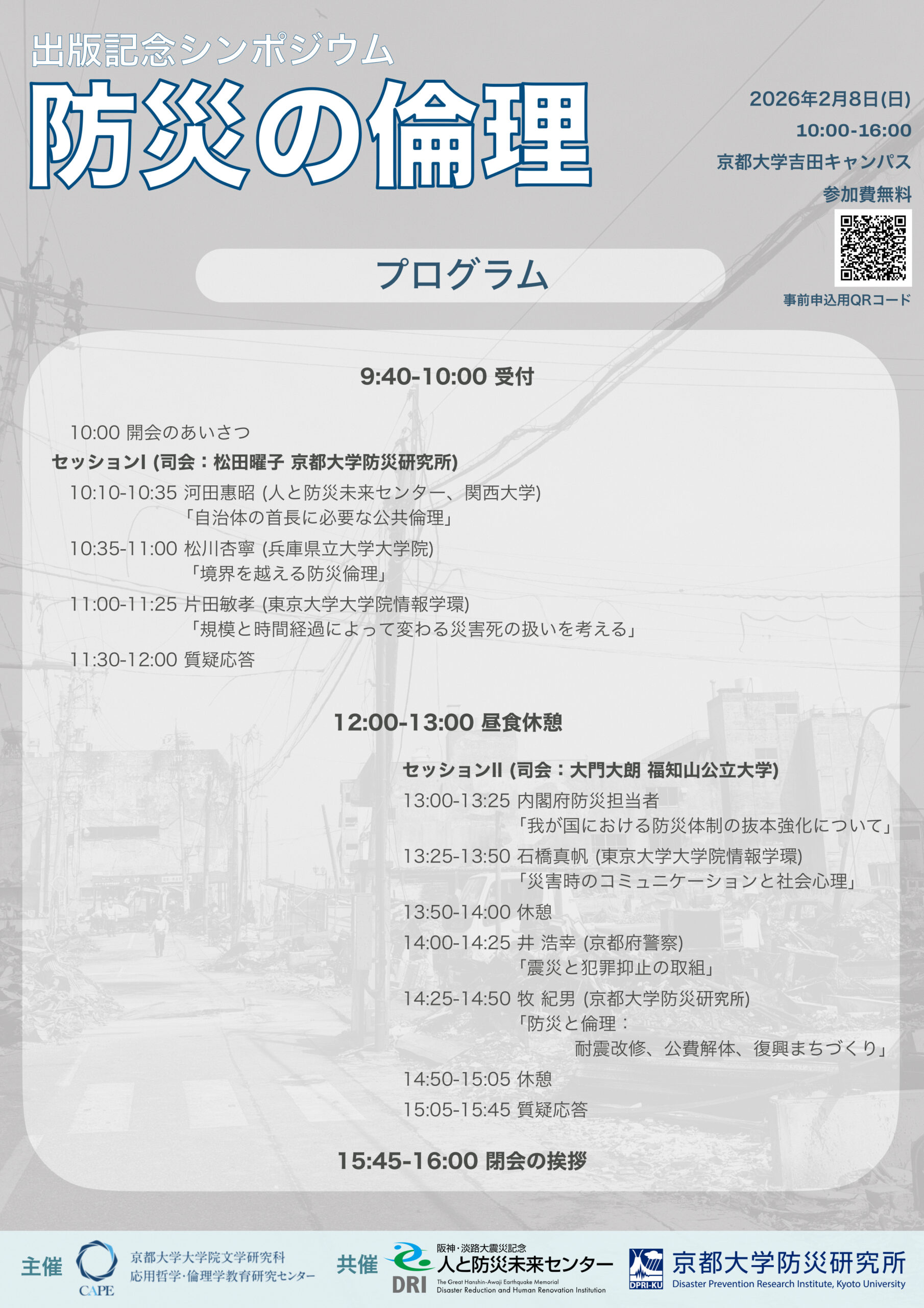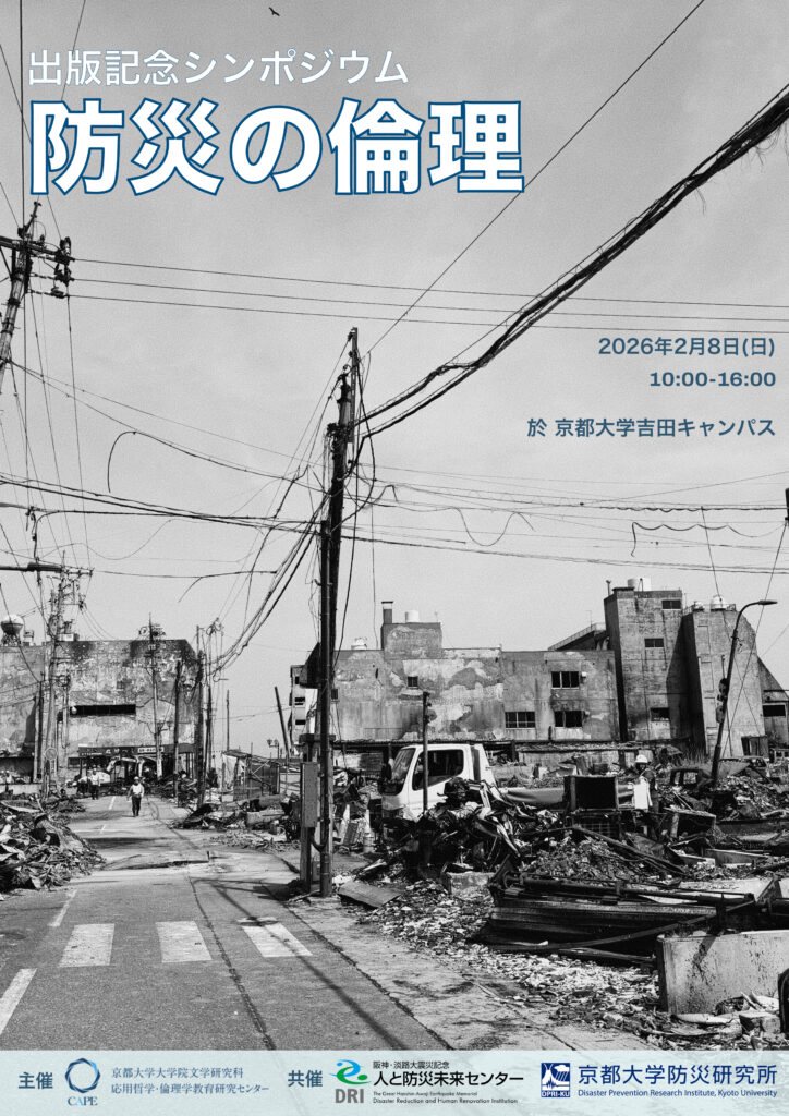 主催:京都大学大学院文学研究科 応用哲学・倫理学教育研究センター(CAPE)、共催:京都大学防災研究所、阪神・淡路大震災記念 人と防災未来センター
