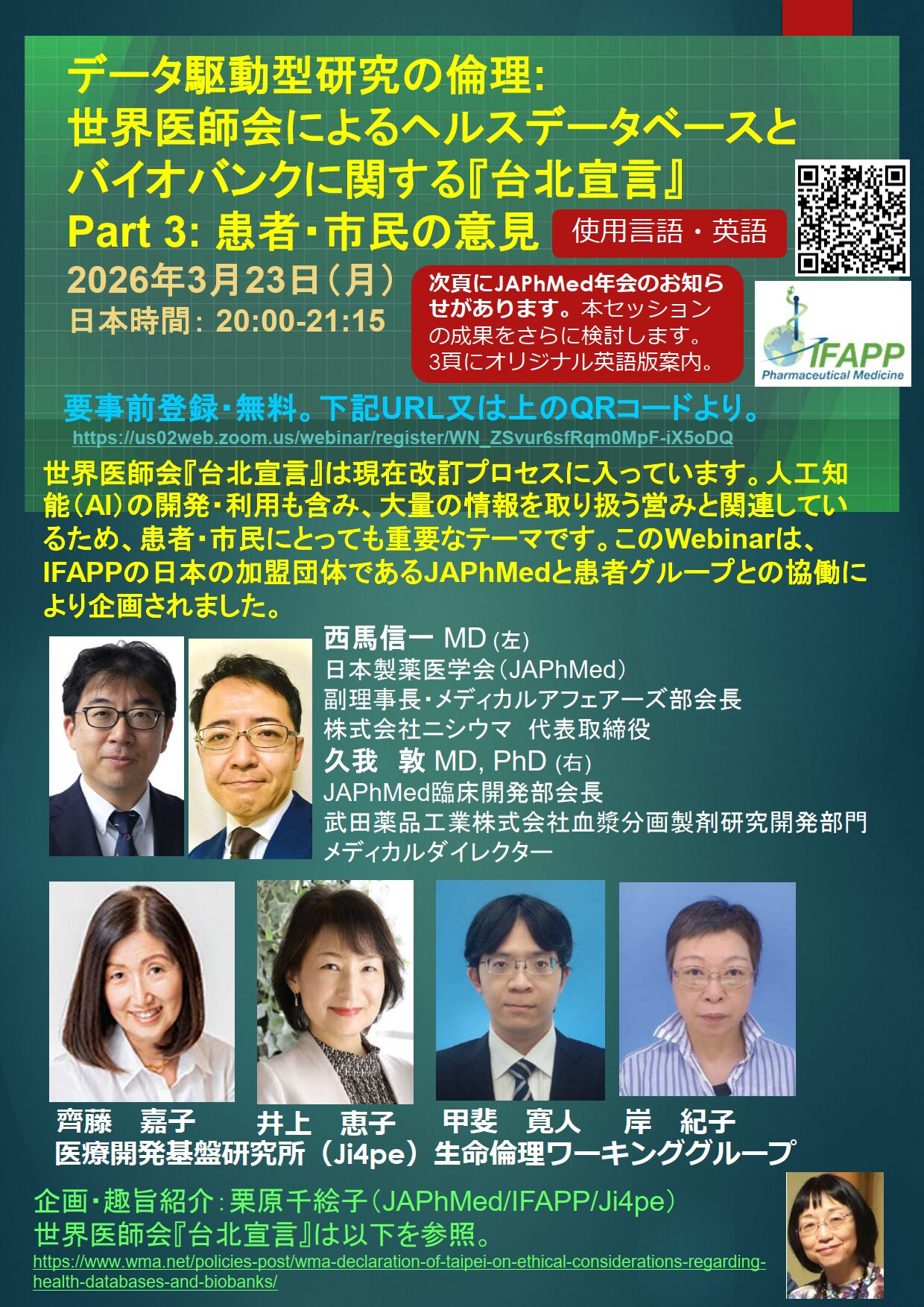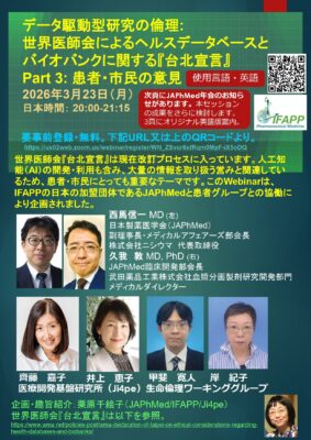 世界医師会「ヘルシンキ宣言」2024年改訂で初めて引用された、ヘルスデータベースとバイオバンクに関する「台北宣言」が現在改訂作業に入っています。日本の患者・市民グループが、「台北宣言」改訂に向けた意見をとりまとめ、世界医師会に直接届けるためのウェビナーを、国際製薬医学会(IFAPP)と日本製薬医学会(JAPhMed)のコラボ企画として、3月23日(月)日本時間8pmから開催することになりました。