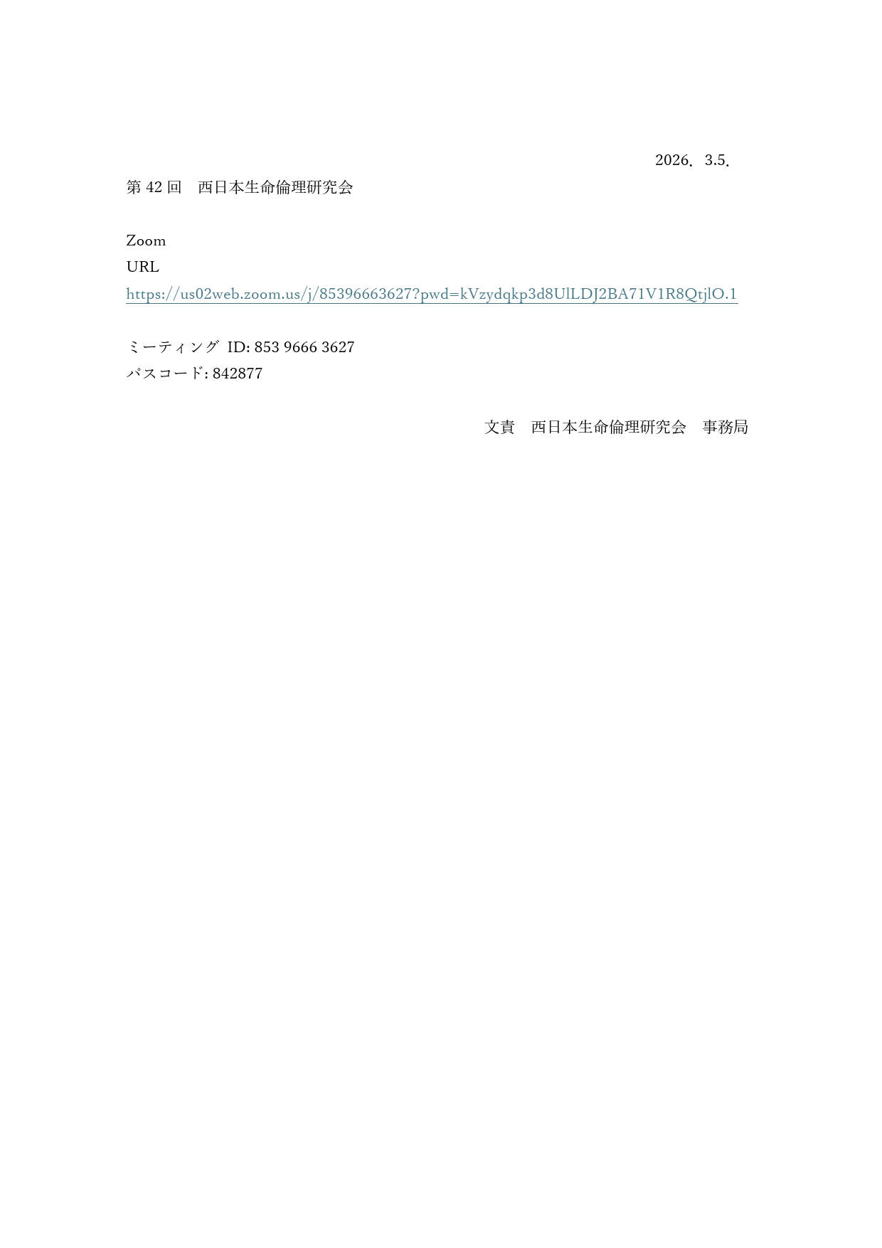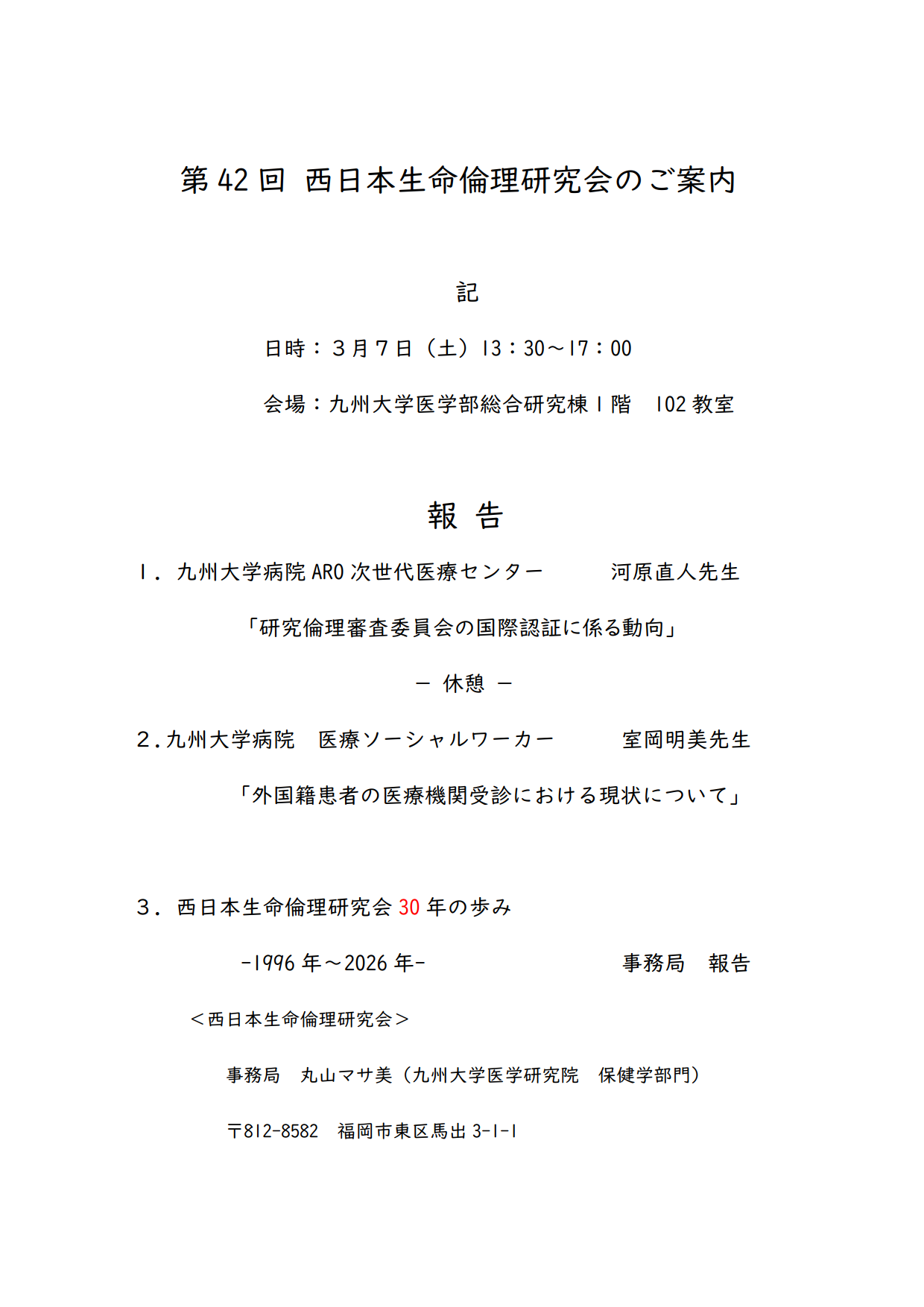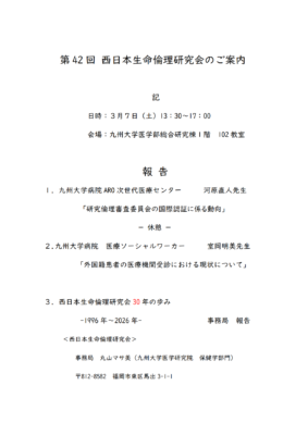 第42回 西日本生命倫理研究会を開催いたします。万象お繰り合わせの上、ご出席を賜りますようご案内申しあげます。演題は、別紙チラシをご参照下さい。(開催方法)開催教室Wifi環境が不安定な為、研究会は原則対面です。今回は強い要望によりZOOM配信(URL別紙チラシ)します。